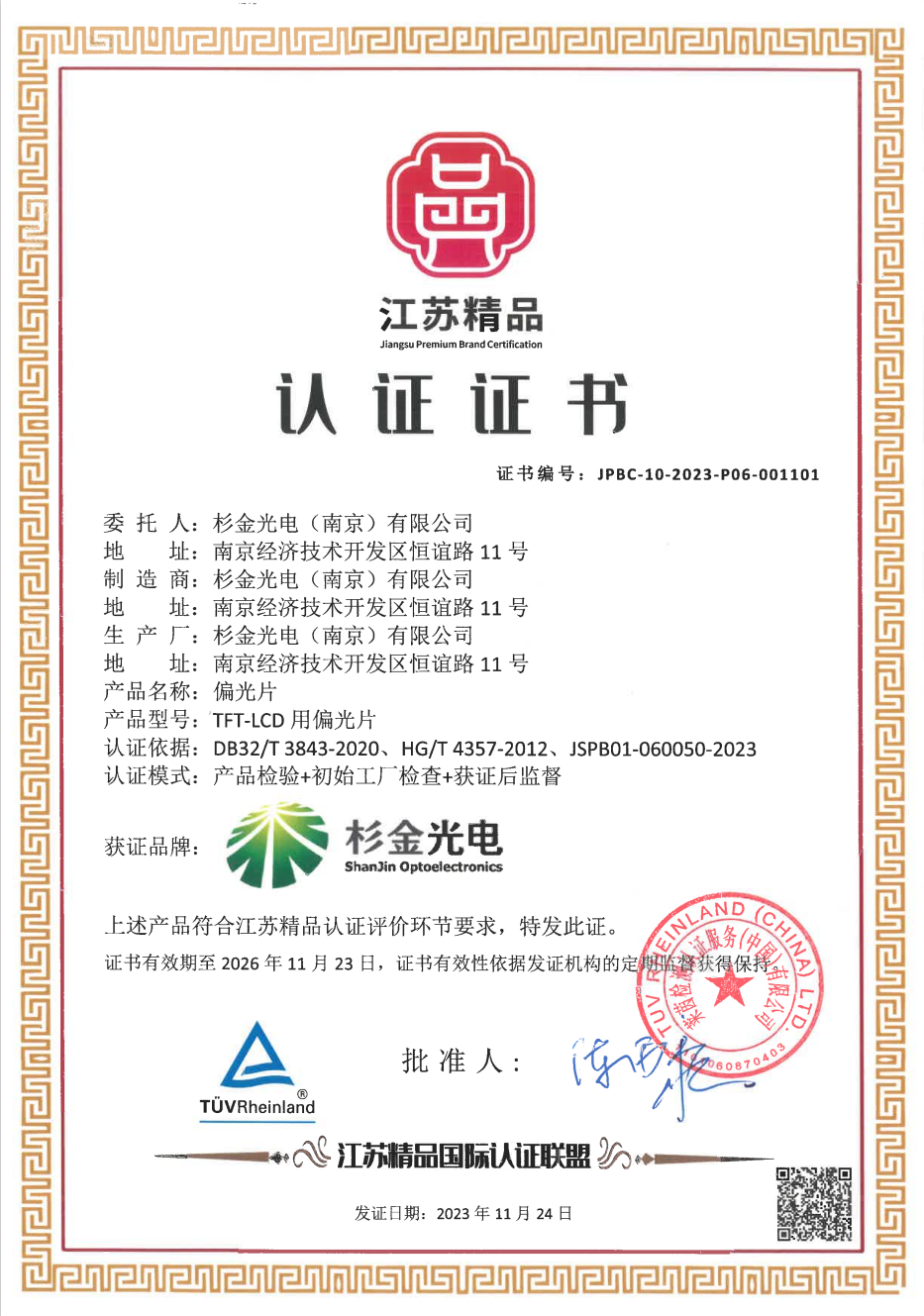 杉金光電自成立以來,一直致力于偏光片技術的研發和創新,憑借強大的技術實力和嚴格的質量管理體系,為眾多客戶提供高品質的產品和服務。此次榮獲“江蘇精品”認證,不僅是對杉金光電過去努力的認可,更是對公司未來發展的極大鼓舞。