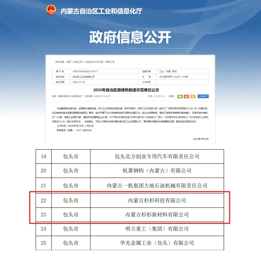 7月16日,內蒙古自治區工業和信息化廳發布《2025年自治區級綠色制造示范單位公示》,內蒙古杉杉科技有限公司及內蒙古杉杉新材料有限公司成功獲評“綠色工廠”。標志著企業在履行環保社會責任方面獲得政府部門認可,也為地區完善綠色制造體系,助力實現“雙碳”目標作出貢獻。
