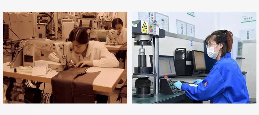 左圖:1998年女員工在傳統縫紉機前埋頭苦干 右圖:2019年技術人員在精密設備前從容操作